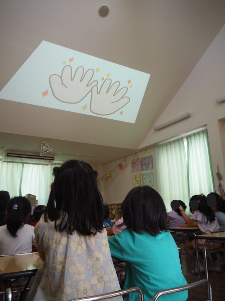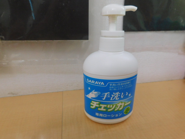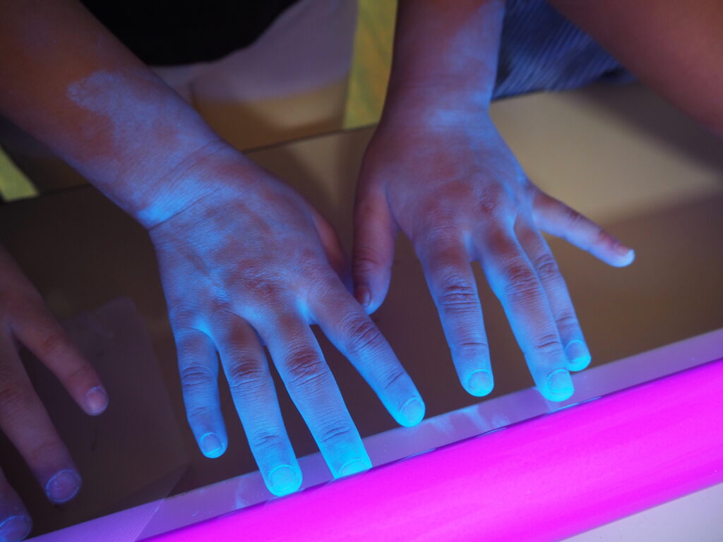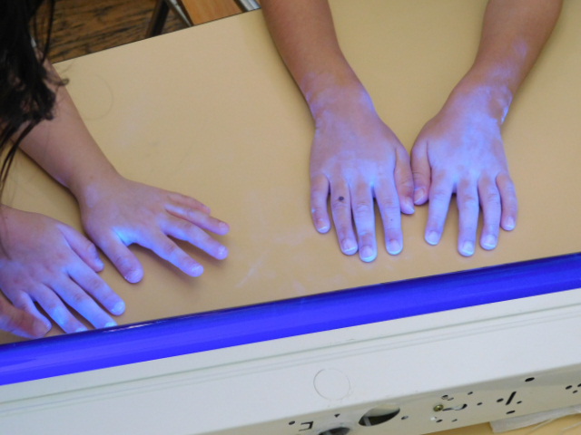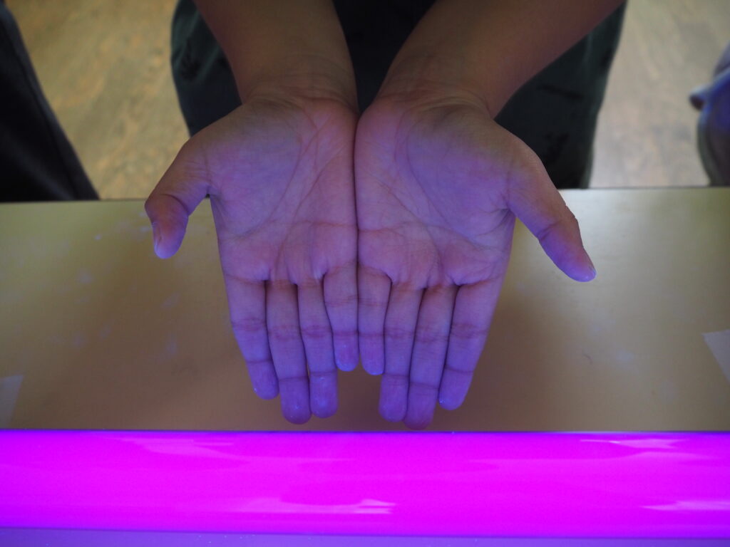 その手をブラックライトに当てると洗い残した部分が白く光り、きれいに洗ったと思っていた子ども達はびっくりです。いつもと同じ洗い方では充分に洗えていなかった事に気付いた子ども達は、どうやったらきれいに洗えるか手の洗い方を、天井に映し出された動画を見て、一生懸命学んでいました。
