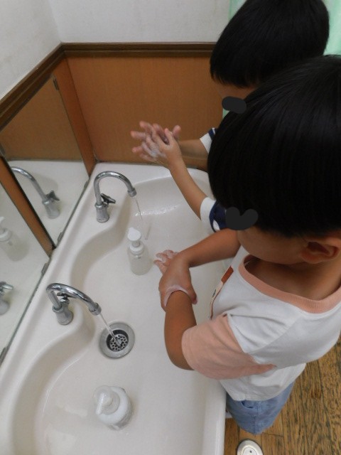 このように楽しく手の洗い方を学んだ子ども達。秋から冬にかけて「みかん狩り」や「秋の味覚祭」など美味しくて楽しい行事がたくさんあります。「手洗い指導」を通じて元気に参加してほしいと願っています。