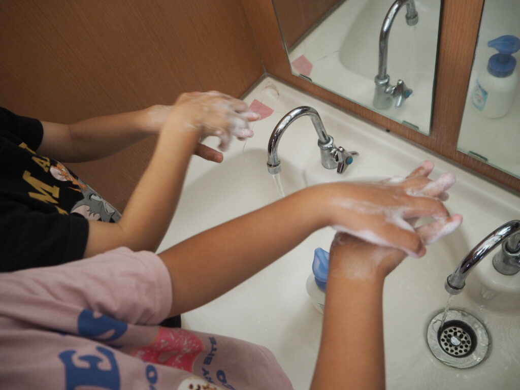 手の洗い方を学んだあと、実践としてもう一度手を洗います。今度は洗い残しのないように時間をかけて丁寧に洗っていました。