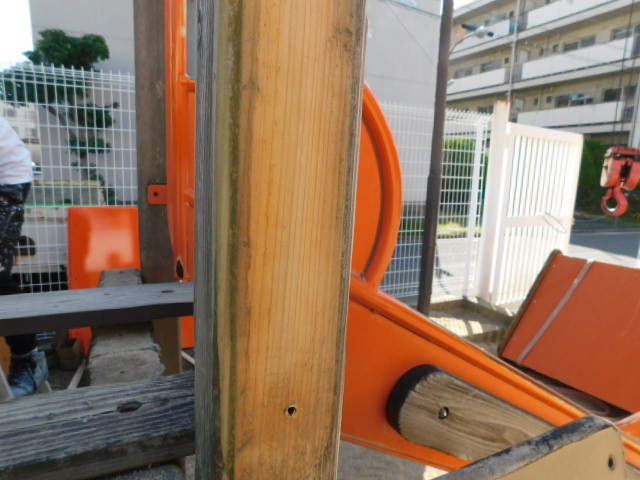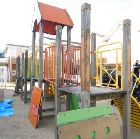 そんなひがし保育園のシンボルでもあり、当時はピッカピカだった大型遊具も、長年の雨風にさらされて、気づけばいろいろなところに劣化が見られるようになってきました。