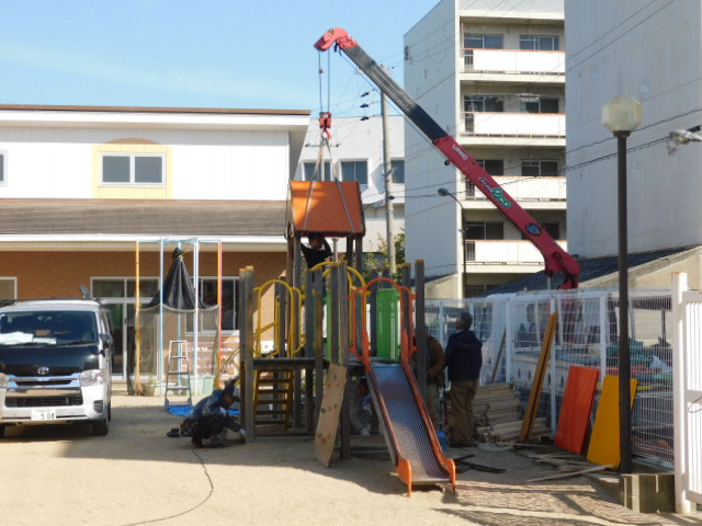 ひがし保育園が開設して以来、18年間、晴れの日も雨の日もずーっと子ども達を見守ってきて、子ども達が何度も何度も遊んできた大型遊具。