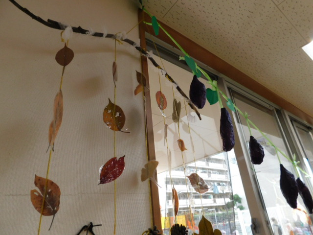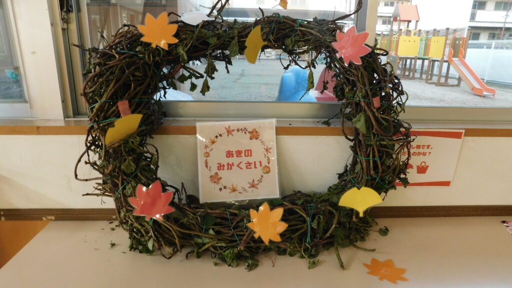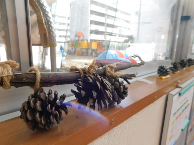 11月になって、早、1週間が過ぎようとしています。この1週間は楽しい行事がたくさんありましたが、中でも、秋をテーマにした『秋の味覚祭』が開催され、それに合わせてひがし保育園もどんぐりや松ぼっくりを可愛く飾り付けて、模様替えしています。