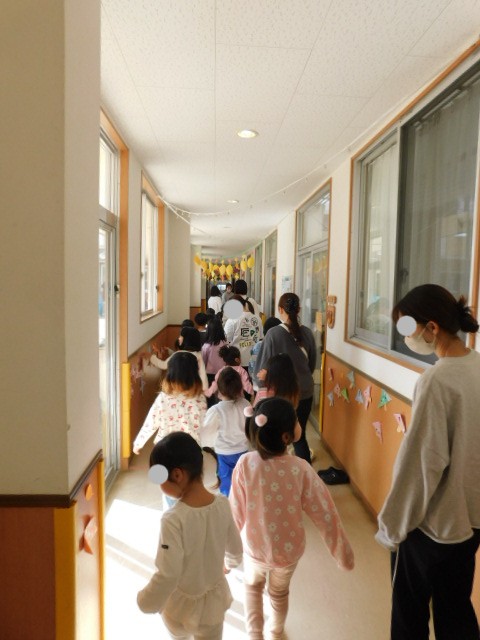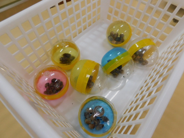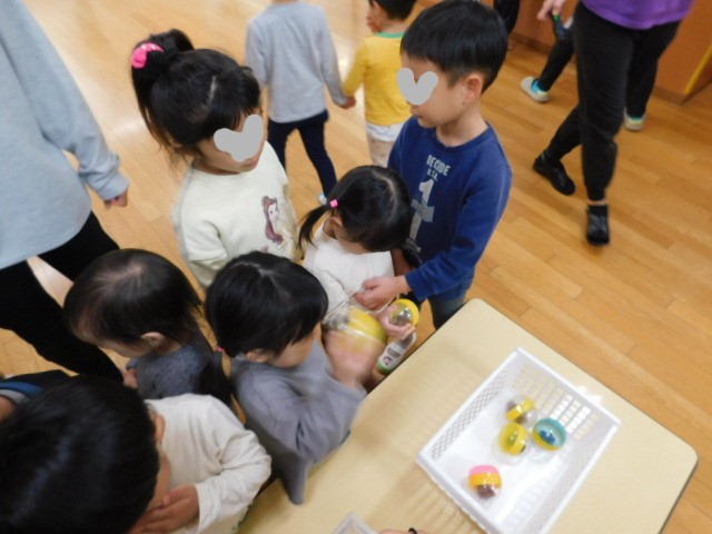 どんぐりのマラカスもあり、どんぐりの音色に耳を傾ける子もいました。どんぐりマラカスに手が届かない小さい子のために、年上の子が優しく取ってあげたりと、異年齢交流が持つステキな場面も見られました。