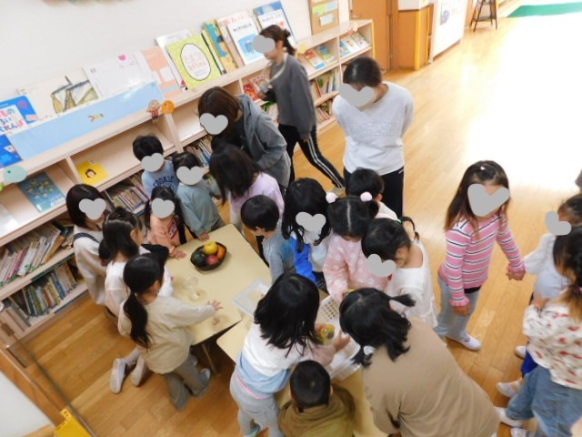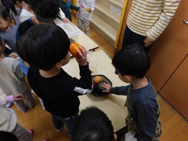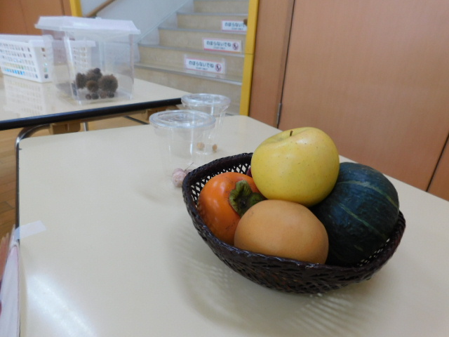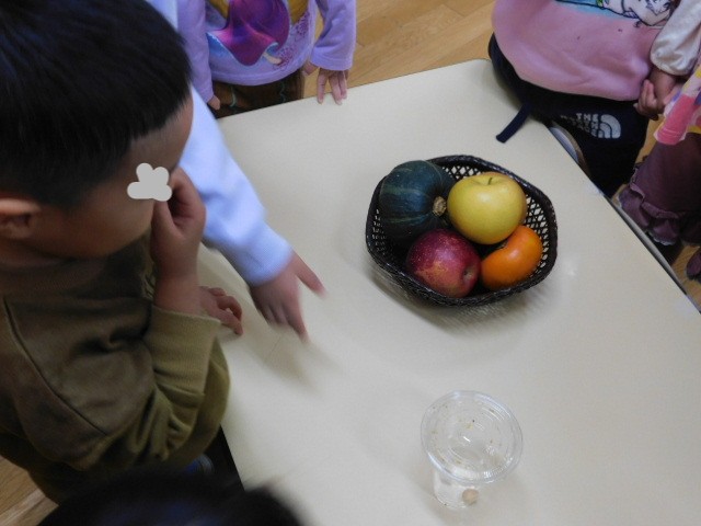 この日は、異年齢交流で「秋」がちりばめられている園内を散策しました。玄関ホールには、リンゴや梨、かぼちゃなど、本物の秋の味覚が展示されており、子ども達は実際に手に取って、その感触を確かめてみたり、いろいろな果物や野菜のにおいの違いを楽しんだりしていました。