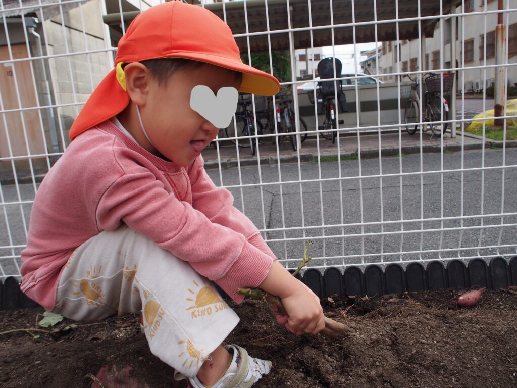 3歳児クラスは保育園の芋畑での収穫は初めての体験です。畑に詳しい専門知識を持った人が育ててきたのではなく、保育園の先生達が、自分達で調べて、見様見真似で畝を作ったりと、試行錯誤を繰り返しながら育ててきたので、芋が実っているかとても不安でした。