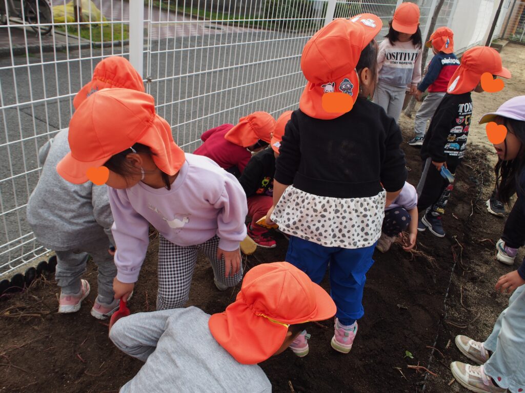 春に植えたお芋の苗が、夏になると元気よく生い茂り、秋にはたくさんのバッタなどの虫が見つかり、虫好きな子ども達にとっては格好の憩いの場となっていた芋畑ですが、11月に入り、そろそろ、お芋の収穫時期となりました。5歳児クラスはみかん狩りで芋ほりも一緒に体験し、4歳児クラスは貝塚高校の芋畑に出向いて、お芋の収穫体験をすることができました。