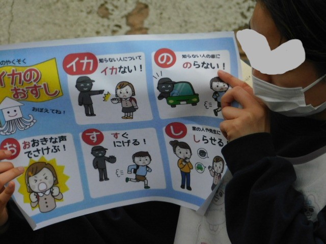 火事の時は「おさない」「はしらない」「しゃべらない」「もどらない」の約束があり、頭文字をとって「お・は・し・も」という分かりやすい標語があるのですが、不審者の訓練でも、わかりやすい標語があり、担当の先生が子ども達に分かりやすく伝えていました。
