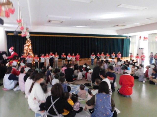 みんなでサンタさんに歌のプレゼントをしたり、5歳児クラスの子ども達がサンタさんに質問したりして、サンタさんと楽しく交流しました。