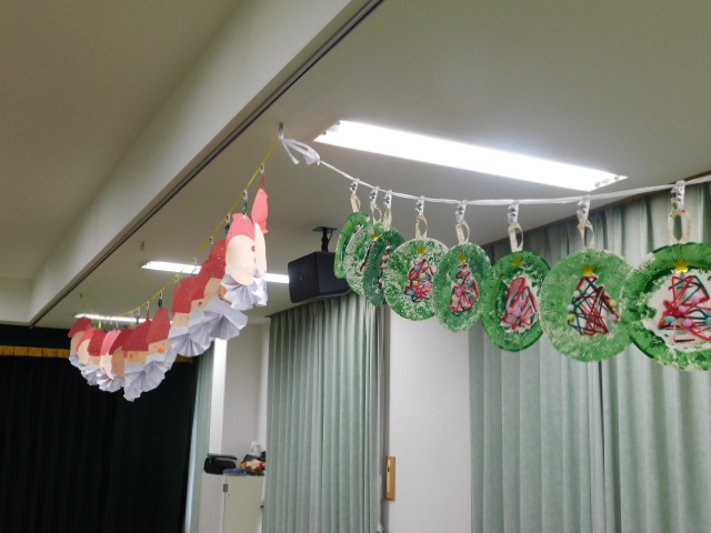 会場であるホールには、子ども達が作ったクリスマスの製作が飾られており、いつものホールが、クリスマスのステキな空間に大変身です。