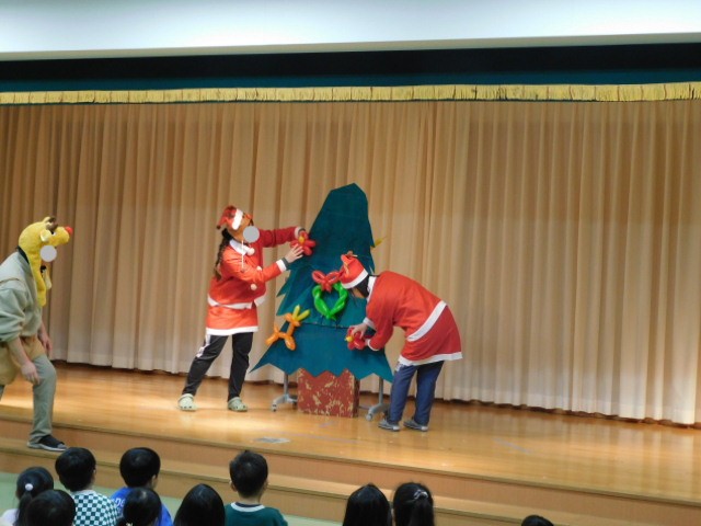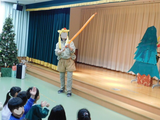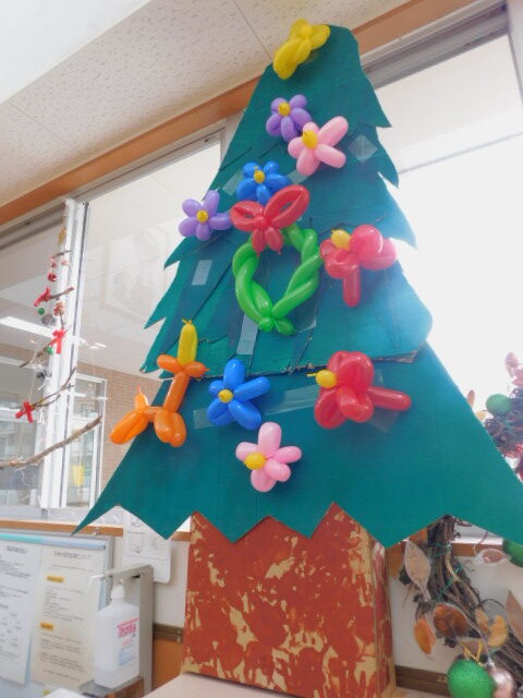 先生達の出し物の最後を締めくくるのは、アートバルーンです。ペンシルバルーンで、トナカイやリースなど、クリスマスに関するバルーンを作ったり、バルーンのお花をたくさんクリスマスツリーに飾り付け、ステキなアートバルーンのクリスマスツリーが完成しました!