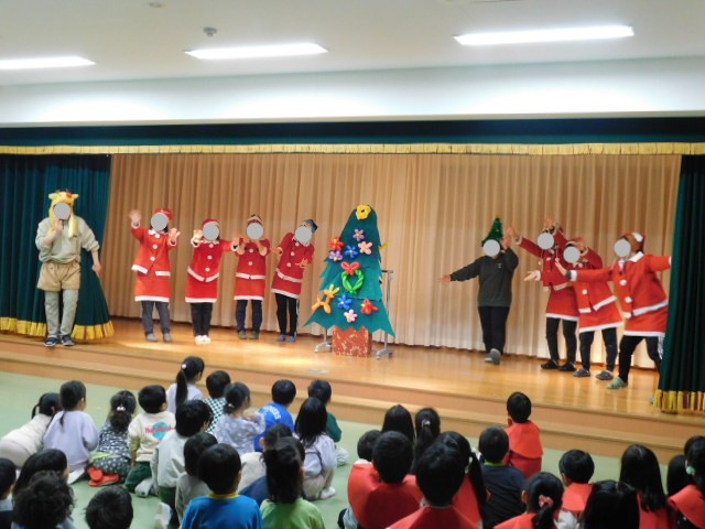 次の出し物は、先生達によるハンドベルとマジックショーです。ハンドベルでは、「もろびとこぞりて」の曲を演奏してくれました。静かなホールに響き渡るきれいなベルの音に子ども達もうっとりです。続いて、マジックショーが始まり、魔法が使えると言い出した先生が取り出したのは、ラーメンカップ。先生が気合を入れると、ふわっと宙に浮いて、子ども達もビックリ!続いて、ハサミで切ったはずの星型の紙が、全部つながっているマジックや、クリスマスツリーに飾られていた玉を使ったマジックなど、子ども達も大喜びです。