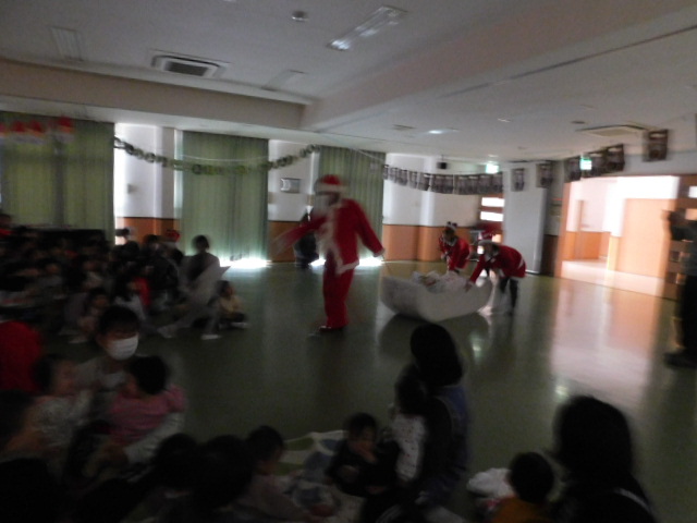そうこうしていると、ホールが暗くなり、待ちに待ったサンタさんが登場しました。子ども達はサンタさんに手を振り大喜びです。