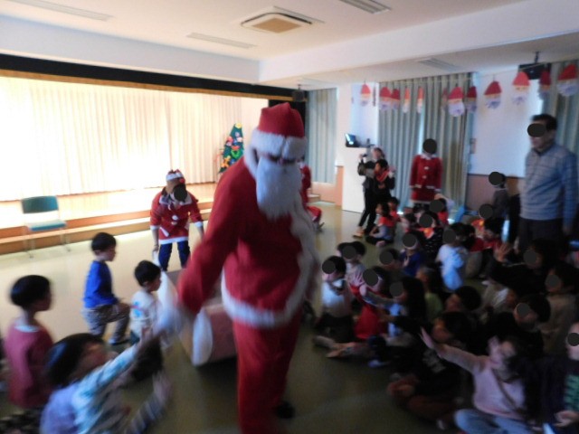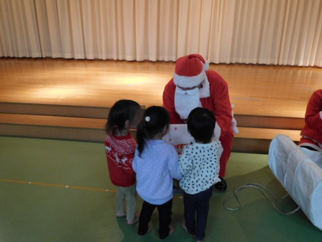 サンタさんも、子ども達にプレゼントを持ってきてくれて、子ども達も嬉しそうでした。最後にサンタさんと記念写真をとって、クリスマス会は終了しました。