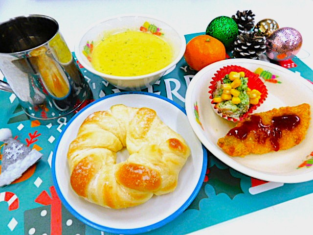 楽しみは、まだ続きます。この日の給食は、クリスマスの特別メニューで、幼児クラスの子ども達には、いつも食べているロールパンがクリスマスリースの形をしたパンに変身!雪みたいに粉砂糖もかかっており、クリスマスにぴったりのパンでした。