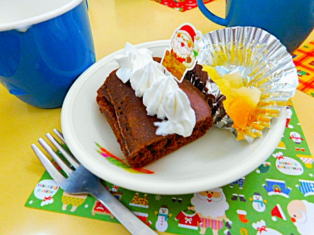 おやつも特別メニューで、ココアホットケーキに、フルーツやホイップクリームを添えて、クリスマスケーキ風のおやつでした。この日は、朝からクリスマス一色の、寝ても覚めても楽しいことがいっぱいの特別な日となりました。