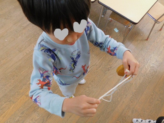 初めてコマに触れる子も多く、紐を巻くことから苦戦する子もいましたが、粘り強く取り組む姿も見られました。先生達に教わりながら、初めてコマを回すことが出来た子は、とても嬉しそうに喜んでいました。