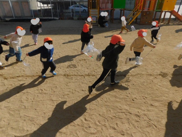 3歳児クラスでは、手作りの簡単凧を手に持ち、空に舞うよう園庭を元気に走り回っていました。
