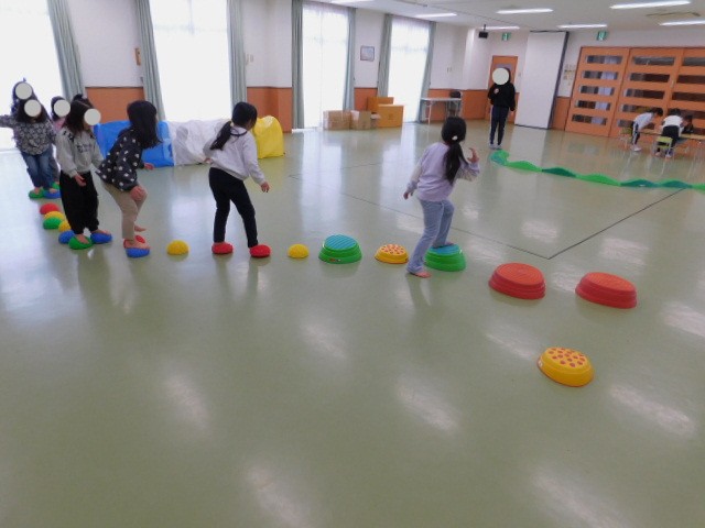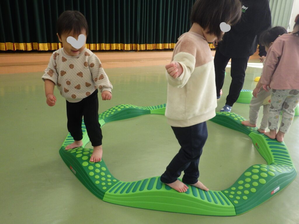 その助成金で、購入させていただいた運動遊び用具の中に、「バランスミニお山」「ウェーブバランス平均台」「レインボーバランスストーン」があります。これらの運動遊び用具は、低年齢児より使用でき、子ども達の年齢や発達に応じて、自由に組み合わせることが出来、楽しんでバランス感覚や体幹を鍛えることが出来ます。また子ども達自身でも、組み合わせて遊ぶことが出来るため、年長児にもなると、友達と一緒に試行錯誤しながら、並べ替えたりしており、主体的に遊ぶ姿も見られました。