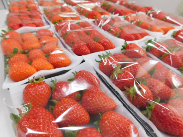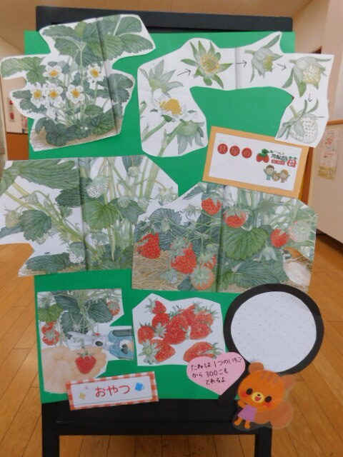 このいちごは、貝塚市内のいちご農園で購入しました。「さつまおとめ」「かおりのちゃん」「スターナイト」という3種類のいちごがあり、どれも大きな粒がきれいに揃っており、はじけんばかりの輝きを放っています。事前にいちごに関する絵本やお話を聞いていたので、子ども達も興味津々です。おやつの時間までお預けで、給食室に運ばれていくいちごを名残りおしそうに見つめる子ども達でした。