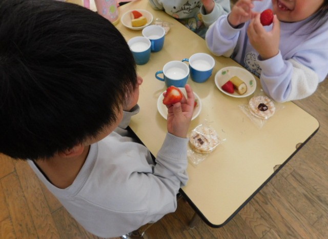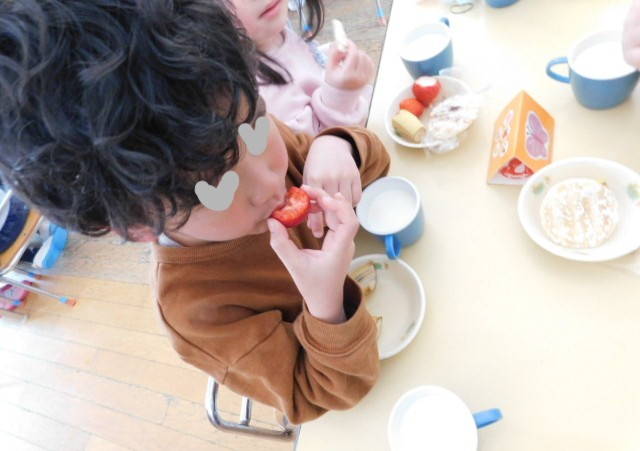 甘い香りに、まだかまだかと待ちきれない子ども達。いただきますの挨拶の後、早速、いちごにかぶりついていました。「おいしい!」「めっちゃ甘い!」「家のいちごと違う!」いろいろなところで、驚きと喜びの声が溢れかえります。
