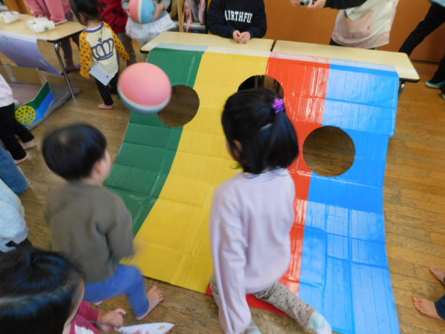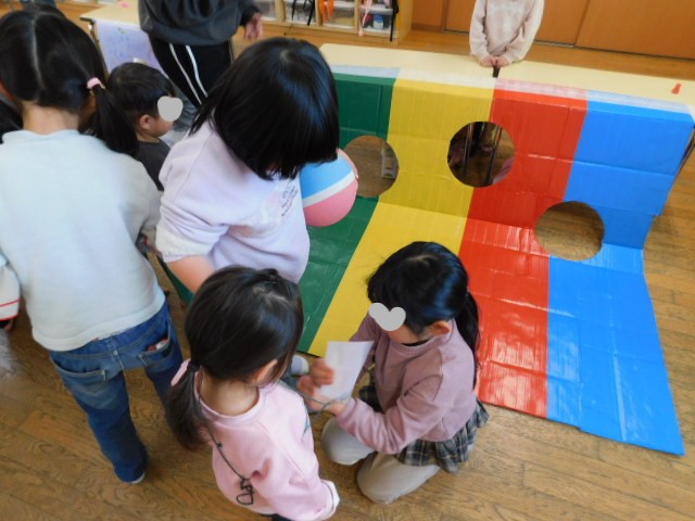 待ちに待ったゲームセンターごっこの日、招待を受けた他クラスの子ども達がドキドキワクワクしながら5歳児クラスを訪れます。店員になりきった5歳児クラスの子ども達が元気よく「いらっしゃいませ!」と声をかけ、遊びのコーナーへ案内してくれます。遊び方を優しく教えてあげたり、スタンプカードにハンコを押してあげたりと、『おもてなし』と『おもいやり』の心が溢れかえっており、とても温かなゲームセンターになっていました。