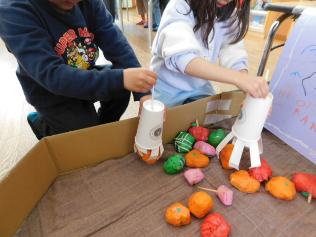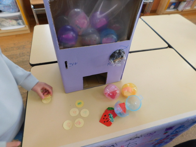その数日後、5歳児クラスの子ども達が、いろいろなクラスに、『2がつ19にち げーむせんたーに あそびにきてね!』と書かれた、大きな招待状を届け周っていました。もうすぐ卒園してしまう5歳児クラスの子ども達が、他クラスの子ども達と一緒に、楽しい思い出作りをしようと、UFOキャッチャーやもぐらたたき、ガチャガチャ等の遊びのコーナーをサプライズで作ってくれていました。