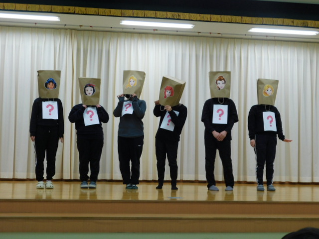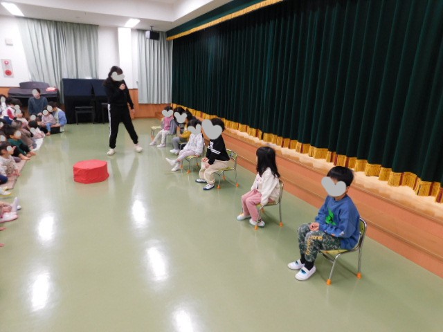 次の催しは、紙袋を被った先生の名前を当てるゲームです。みんな同じような黒い服を着ていたので、ヒントは声だけです。でも、さすがの子ども達です。声を聞いただけで、「あ!〇〇先生や!」といろいろなところで声があがります。ひがし保育園では、違うクラスの先生も、子ども達とたくさん関わる機会があるので、子ども達にとっては、どの先生の声も馴染みのある声だったようで、すぐにわかる子がたくさんいました。
