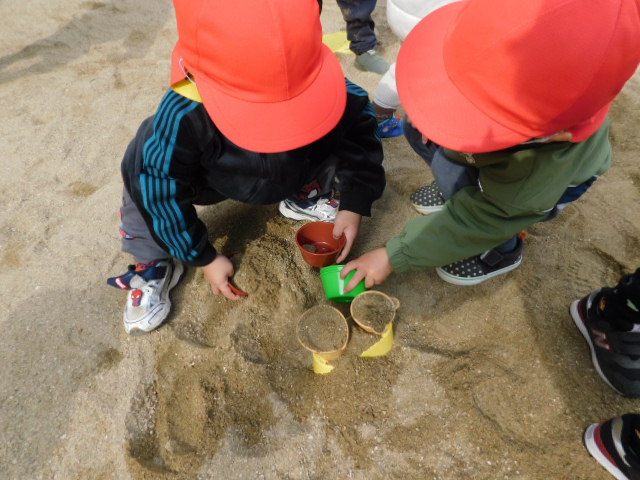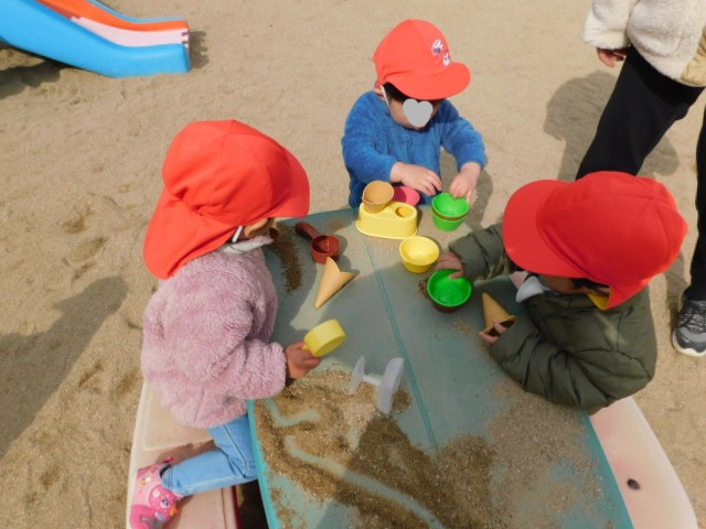 この日、初めて子ども達にお披露目しました。まだ、砂粒ひとつついていないピカピカの玩具に、目が釘付けです。早速、玩具を手に取り、嬉しそうに遊び始めていました。乳児クラスの子ども達は、砂を掘ったり、お皿に砂を入れたりと、砂の流動性や感触を楽しんだりしていましたが、幼児クラスにもなると、お皿の上に、上手に型抜きをしたり、アイスクリーム屋さんみたいに、並べてごっこ遊びに展開する子もいました。砂場の玩具1つをとっても発達や年齢に応じて、いろいろな遊びを楽しむ姿が見られました。