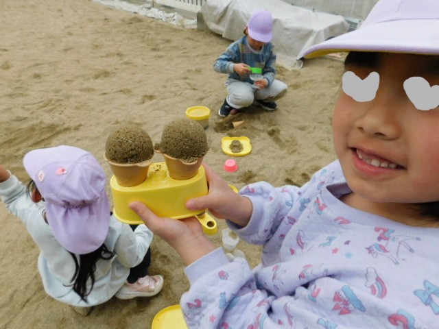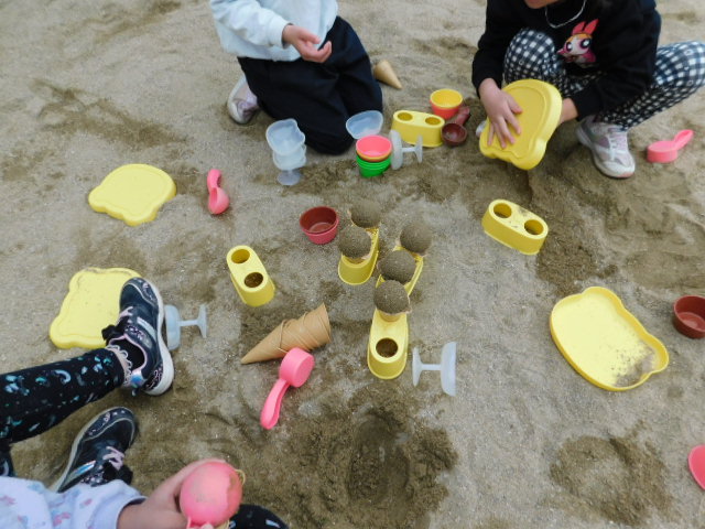 砂場の玩具に、新しい玩具が仲間入りしました。どのクラスの子ども達でも遊べるように、アイスクリーム屋さんごっこも出来る、カラフルなスコップや型抜き等のセットが入った玩具です。