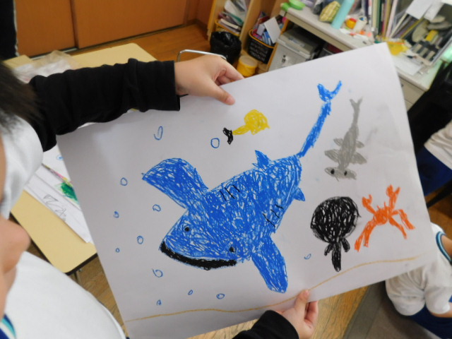 保育園に戻ってくると、眠気は一気に覚めて、また元気に遊び始める子ども達。海遊館の経験画を描くと、インパクトのあったジンベイザメを中心に、いろいろな魚を描く子もおれば、みんなでお弁当を食べている場面を描く子もおり、それぞれの思い出に残るステキなおわかれ遠足となりました。