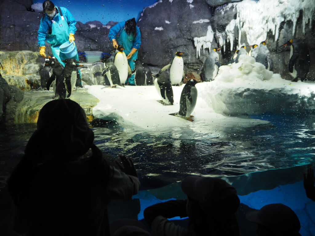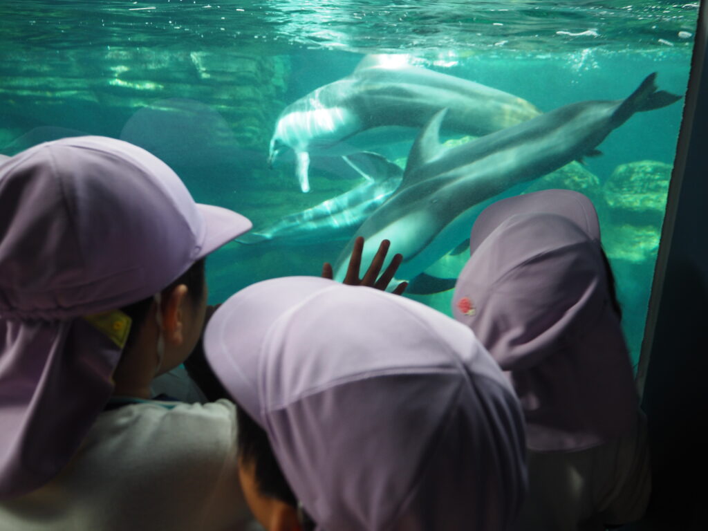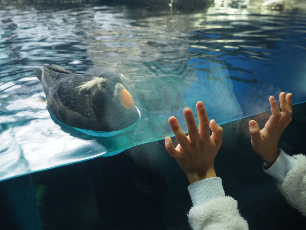 海遊館は、エレベーターで最上階まで上がり、そこからぐるりと館内を周りながら降りてくるコースで、途中にいるペンギンやイルカに、子ども達は水槽にへばりつくように目が釘付けです。中央には大水槽があるのですが、そこに2匹の大きなジンベイザメが悠々と泳いでおり、子ども達の方へ近づいてくると、子ども達も大興奮でした。