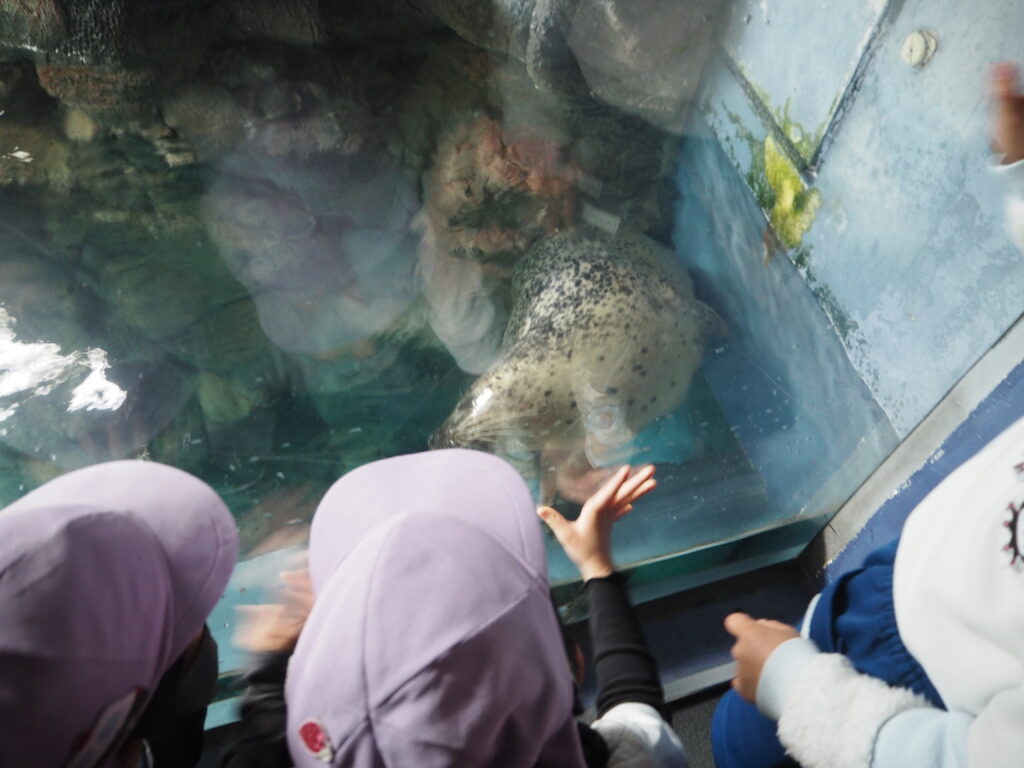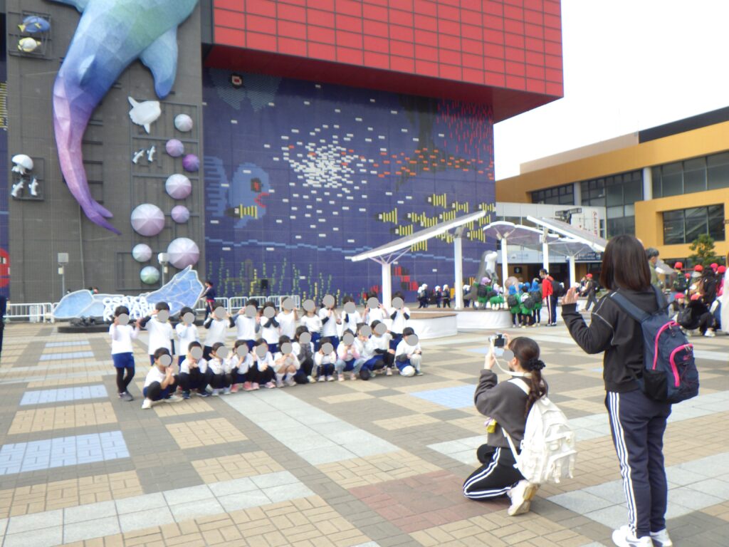 バスに乗って小一時間ほどすると海遊館に到着し、まずは海遊館の前で記念写真を撮りました。子ども達の中には、早く魚を見たくてウズウズしている子もいました。