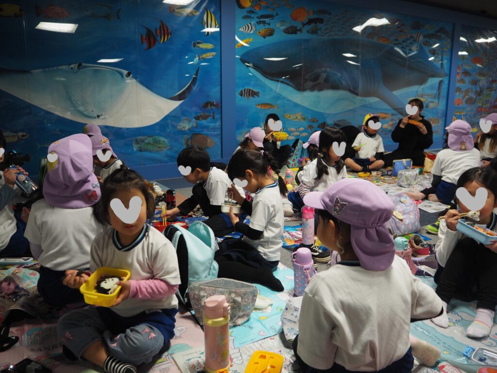 団体休憩場所に移動し、子ども達が楽しみにしていたお弁当の時間です。一般のお客さんは、入ることのできない特別な場所に子ども達はとても嬉しそうです。海の中にいるような壁画の周りで、保育園で食べる最後のお弁当を、夢中になって食べる子ども達でした。