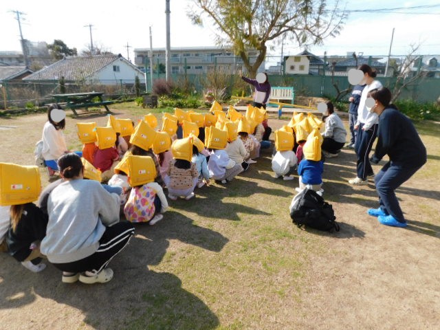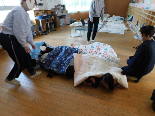 子ども達の生活リズムも考慮し、午睡から起床する少し前の時間に、非常放送を流しました。先生達は、急な非常放送にも、慌てることなく、子ども達を起こして、部屋の安全な場所に誘導していました。子ども達が不安にならないよう、先生達が落ち着いた声掛けをしていたので、多くの子ども達がまだ午睡中でしたが、突然の非常放送に驚きつつも泣いたりする子は少なく、先生達の指示に従って避難することができていました。幼児クラスになると、自分で防災頭巾も被ります。何回も繰り返し防災頭巾を被る訓練をしているので、とても落ち着いています。
