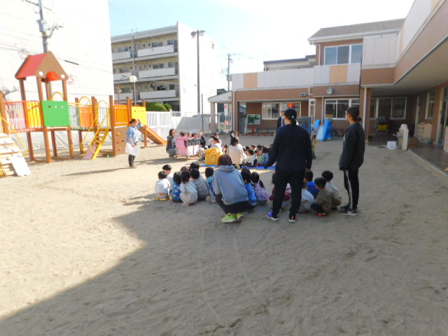 続いて、地震後火災が発生したという設定もあったので、避難指示に従い、屋外に移動します。災害はいつ発生するかわからないので、いつでも安全に避難できるよう、どのクラスも、午睡中はパジャマではなく、動きやすい服装で午睡するようになったのですが、その効果が表れており、午睡中の時間帯だったにもかかわらず、迅速に屋外に避難することが出来ていました。ここでも毎月の避難訓練の成果が出ていました。