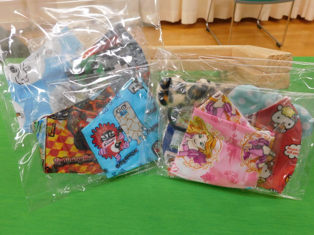 ※このマスクや髪飾りは、在園児の保護者の方からの手作りで、卒園児の為にと寄贈していただきました。ありがとうございました。