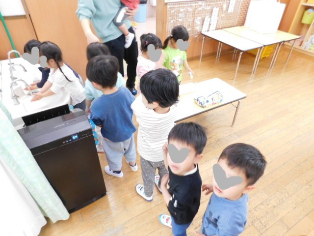 4月になり、新年度が始まりました。3月31日家庭保育に協力してくださったご家庭の子ども達は、この日が引っ越し後初めての登園日となります。進級した部屋に入るなり、自分のロッカーを探す子、間違えて前のクラスに入ってしまう子など様々ですが、どの子も期待に満ち溢れた嬉しそうな表情をしています。