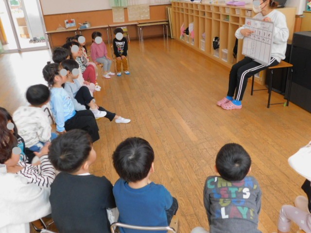 4歳児クラスになると、子ども達が毎日登園した時に、自分ではんこを押す「しゅっせきブック」という毎日の習慣が新たに増えます。しゅっせきブックのどこにはんこを押したらいいのか、新しくなった先生のお話をよく聞く子ども達。今日が何日で何曜日なのか、みんなで確認したりしていました。朝の会などで毎日日付を確認していくことで、自然と曜日感覚が身についていき、曜日感覚が身に付くと、1週間の見通しも持てるようになり、子ども達は楽しみや期待を持ちながら登園できるようになっていきます。今日がその始まりの第一歩。子ども達は新しい生活習慣にドキドキわくわくしています。