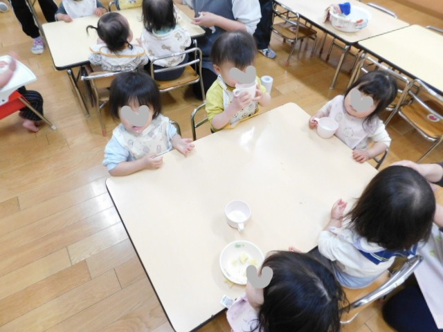 0歳・1歳児クラスは、この4月から入園した子が多く、その子ども達にとっては、何もかもが「はじめて」の体験です。はじめての先生やお部屋に慣れてきたところで、この日、また新たな「はじめて」の経験がありました。そのうちの1つが給食で、午前中にしっかり遊んでお腹がすいた子ども達は、はじめて見る給食に興味津々です。