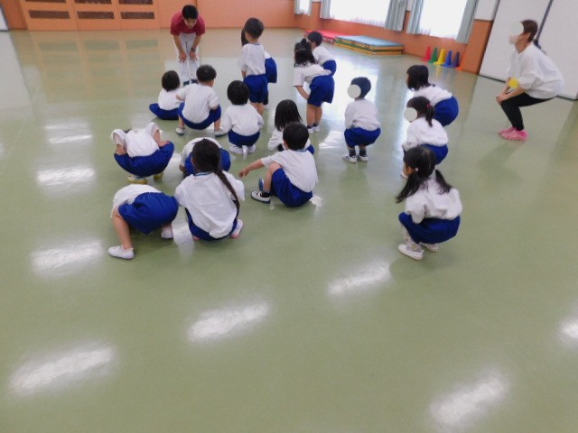 4歳児クラスに進級すると体育指導が始まり、4歳児クラスの子ども達にとっては、体育指導も「はじめて」で、初めて見る体育指導の先生にドキドキです。
