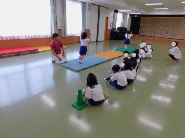 「なんか緊張するわ…」と、うっかり心の声がもれてしまう子もいましたが、体育指導の先生はとても面白い先生で、子ども達の緊張もすぐにやわらぎ、その後は準備体操やマット運動も、やる気満々で取り組む姿が見られました。
