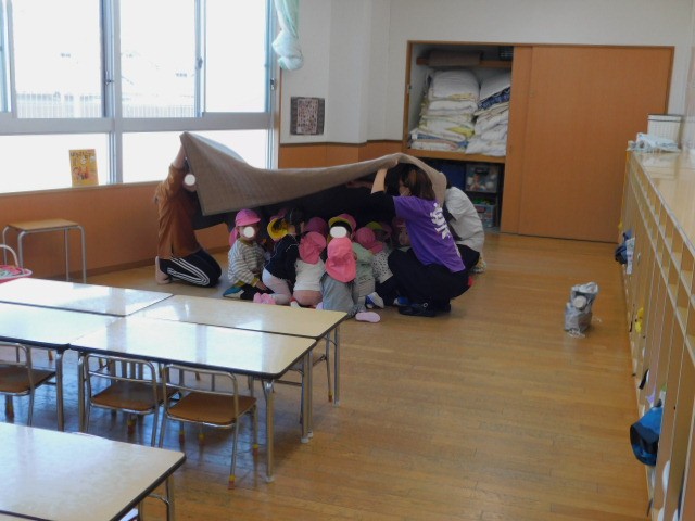 生活にも慣れてきたところで、この日、新年度が始まってから「はじめて」の避難訓練がありました。地震を想定した避難訓練は何回もしてきましたが、進級した部屋でする避難訓練は初めてです。非常放送が流れると、先生達が落ち着いて避難指示を出していたので、どこに避難すればいいかわからなかった子ども達も安心して避難することが出来ました。