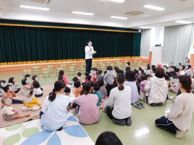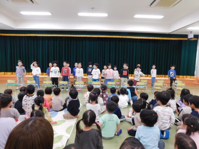 この日は、ホールで「入園・進級会」がありました。「入園・進級会」は、今年度、入園してきたお友達を、みんなの前で紹介したり、入園した子も進級した子も、みんなでお祝いする楽しい行事です。