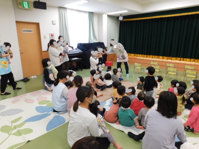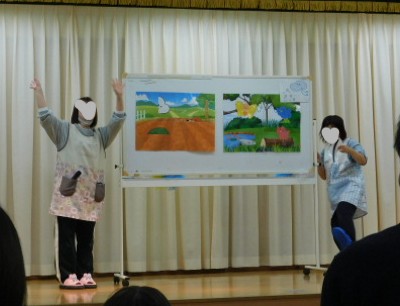 先生達からは、新年度が始まる頃によく歌われる「春が来たんだ」という曲をペープサート仕立てで披露してくれました。子ども達は毎年歌う歌なので、音楽に合わせてみんなで一緒に歌ってくれたので、みんなでお祝いしているかのような、一体感のあるとても楽しい曲になりました。