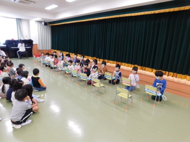 新しいお友達になった新入の子ども達の為に、5歳児クラスの子ども達がプレゼンターとなって、ピアニカ演奏とお歌を披露してくれました。ピアニカ演奏の曲は、みんなお馴染みの「ドレミのうた」です。これから保育園でたくさんの歌を覚えていく子ども達にぴったりの選曲です。